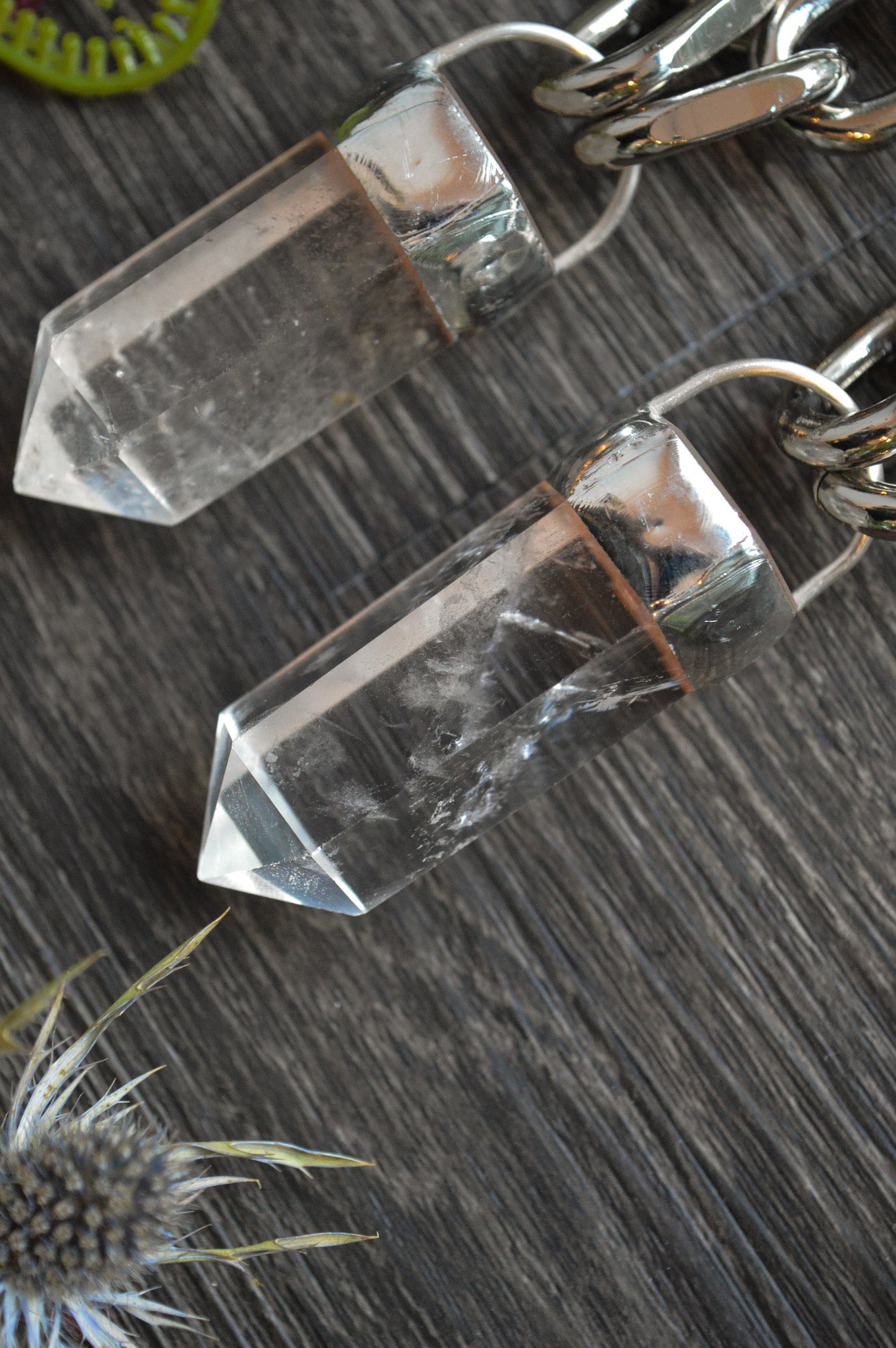 A large polished clear quartz point set on a super chunky silver tone chain, finished with a large stainless steel lobster clasp closure and Luna Amatores laser engraved tag. These can be dressed up or dressed down depending on your outfit, making them super versatile while still making a statement!