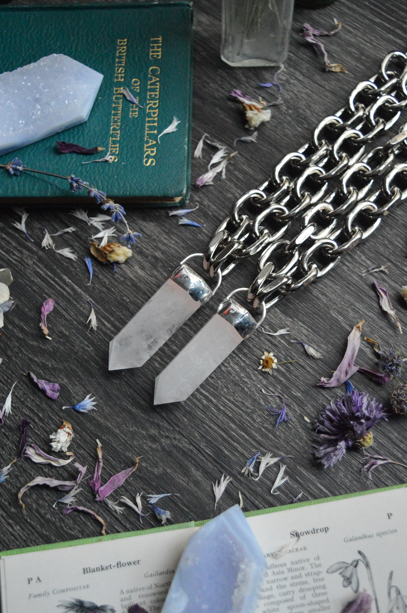 To prolong the life of your handcrafted jewellery, it is advised to avoid contact with water, lotions, perfumes and other chemicals. Crystal jewellery like these chunky chain necklaces require extra care steps as genuine crystals are fragile. Avoid dropping or wearing with another necklace that frequently touches the crystal as the crystal could chip or break.